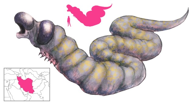 You can tell from the picture that the Indus Worm is carnivorous. By day, they stay in the water and burrow through the mud. Maybe their white skin made them susceptible to getting burned in the sun. It was at night that they would be dangerous. They would attack from below and could grab even animals as big as cows and camels. So, a human would be a snack. They don’t devour prey right away. Instead, they drag them underground to eat when they get hungry. Some stories do have them grabbing animals that are drinking from the river . . . Huh.