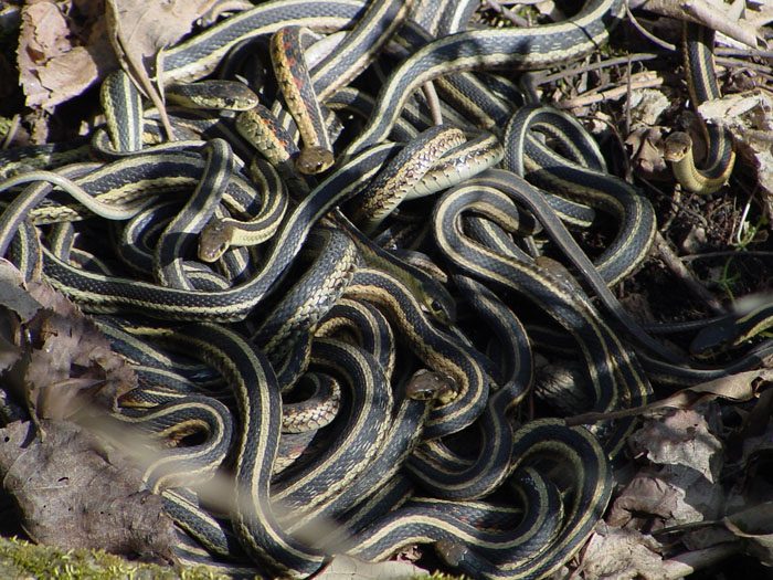 Garter Snakes enter brumation like the box turtles. The difference here is that snakes will hibernate in a massive group. This helps them stay warm during the cold periods.