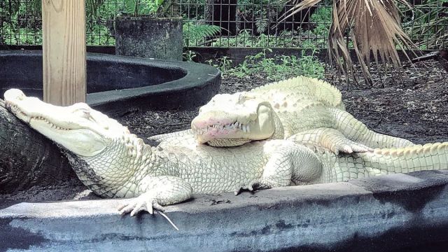 Almost forgot this fun part. There is a fascination with albino alligators. Yet, there are only about 100 in the world. Mostly because they are born white, which makes them easy prey. So, they don’t live very long. Some have been put in captivity though, which allows them to grow up. Like so: