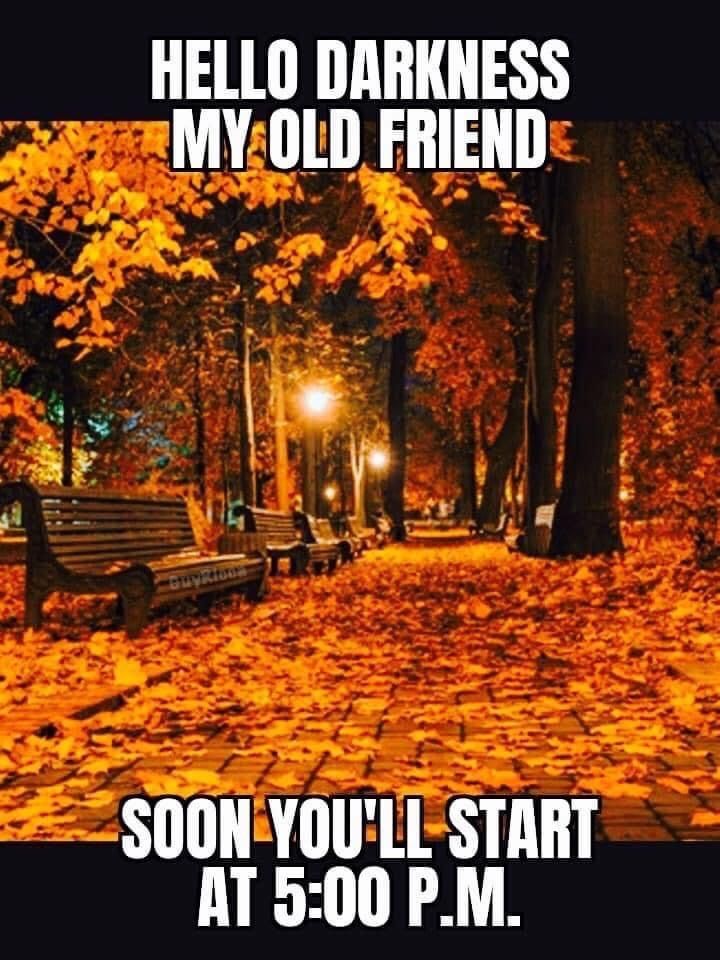 For those of us unfortunate enough to live under the rule of Daylight Savings Time, we end up turning our clocks back an hour. Supposed to save money, help farmers, reduce accidents, or some reason that seems to change every few years. All I know is that I have to change my car clock and it’s a sign that darkness is going to start in around 4:30. The park will close around 5, which means months of having to go to the mall if I want to take a walk after work. The onset of seasonal depression starts appearing for many as well and that pretty much turns the next 5 months into a miserable experience. Here are some memes from a Google Image Search: